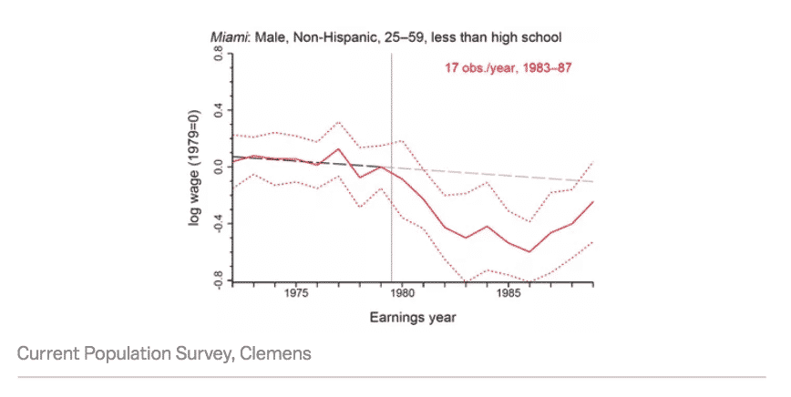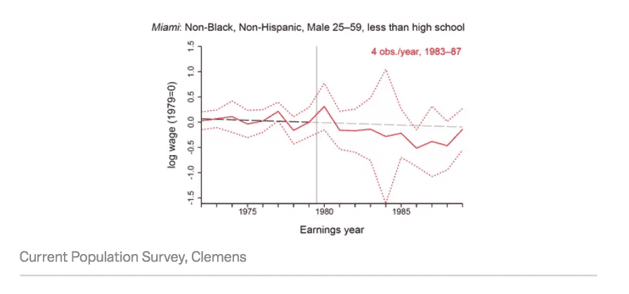 As Clemens shows, this double shift in the share of the black population in the sample and the composition of the black population to include Haitians, systematically skews Borjas’s sample of wages for low-skilled non-Hispanic workers precisely at the moment of the Mariel arrivals. To neutralize that effect, one might be tempted to to focus the analysis only on white low-skilled workers. But at that point the limitations of the survey intrude again. The number of white, male, prime age workers with less than high school education interviewed by the Census Bureau in Miami in 1980 was four. The wages of that plucky squad follow no very strong trend.