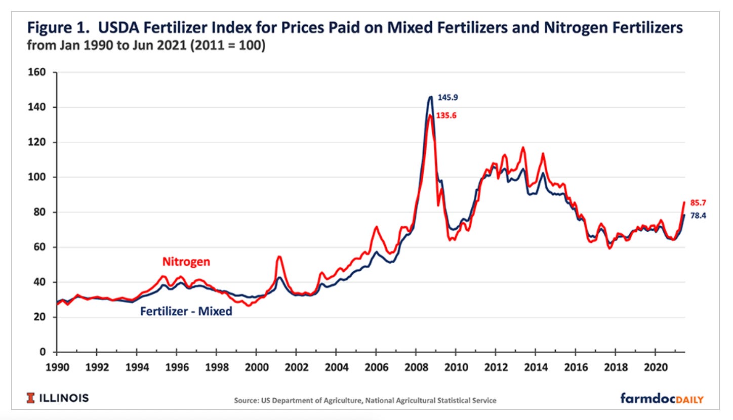 As the saying goes, modern agriculture is a mechanism for turning fossil fuels into food. Not just through mechanized farm machinery but, crucially, through artificial fertilizers. Natural gas is the feedstock for 95 percent of the production of ammonia, which in turn is the key ingredient for the production of nitrogen-based fertilizers. So, rising global gas prices, will feed into rising fertilizer prices, which will feed into higher farmgate prices for food.