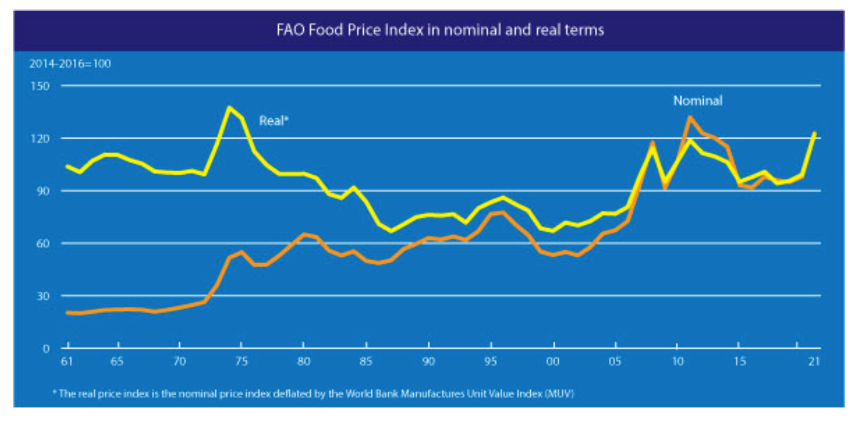 Against this backdrop, it was big news in the last couple of weeks when the FAO sounded the alarm. The FAO’s Food Price index indicates that world food prices have surged above their 2011 level and are now at a level, in real terms, not seen since the 1970s.