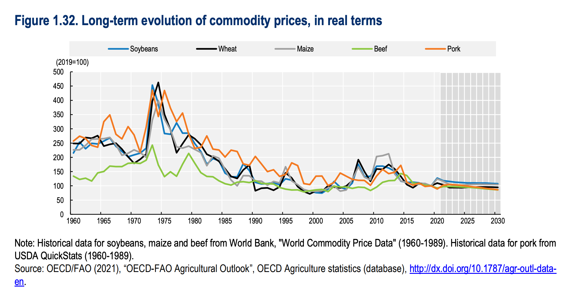 Rather than a composite index, the OECD-FAO graph shows the price of soybeans, wheat, maize, beef and pork separately. Together they make up a substantial part of the FAO food price index and according to the OECD-FAO calculations, in real terms they are up slightly relative to 2020, but they remain very far below their 1970s peaks.