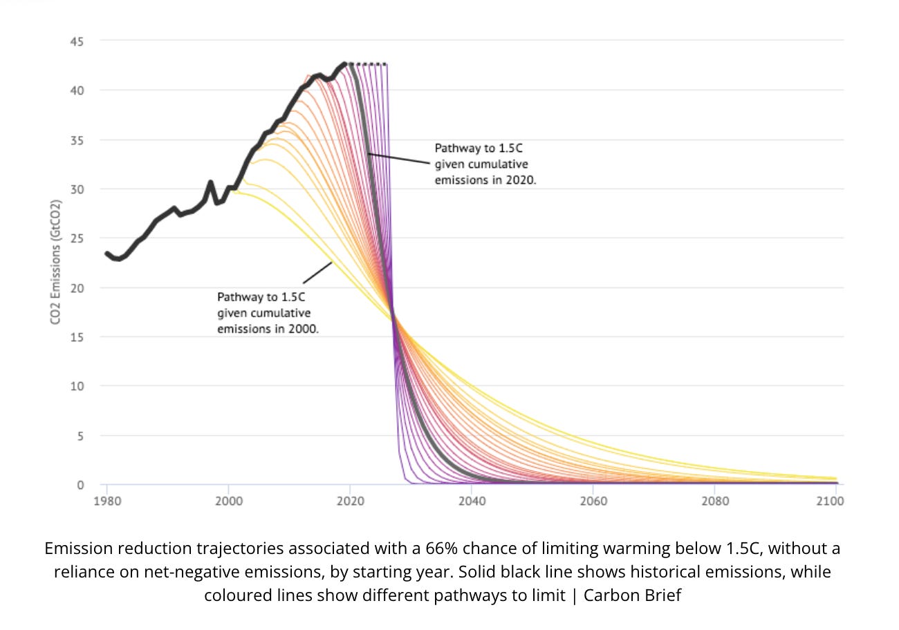 How dangerous this kind of argument is, how little we can afford to make any concessions to the gas lobby right now, is brought out by the recent batch of graphics showing the vertiginous path of decarbonization to which we have condemned ourselves.