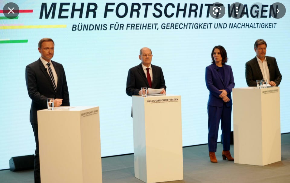 The coalition has issued its founding document, the Koalitionsvertrag (coalition contract) - under the title “dare more progress” - a nod to Willy Brandt’s famous manifesto - “dare more democracy”. It promises an alliance for freedom, justice and sustainability.