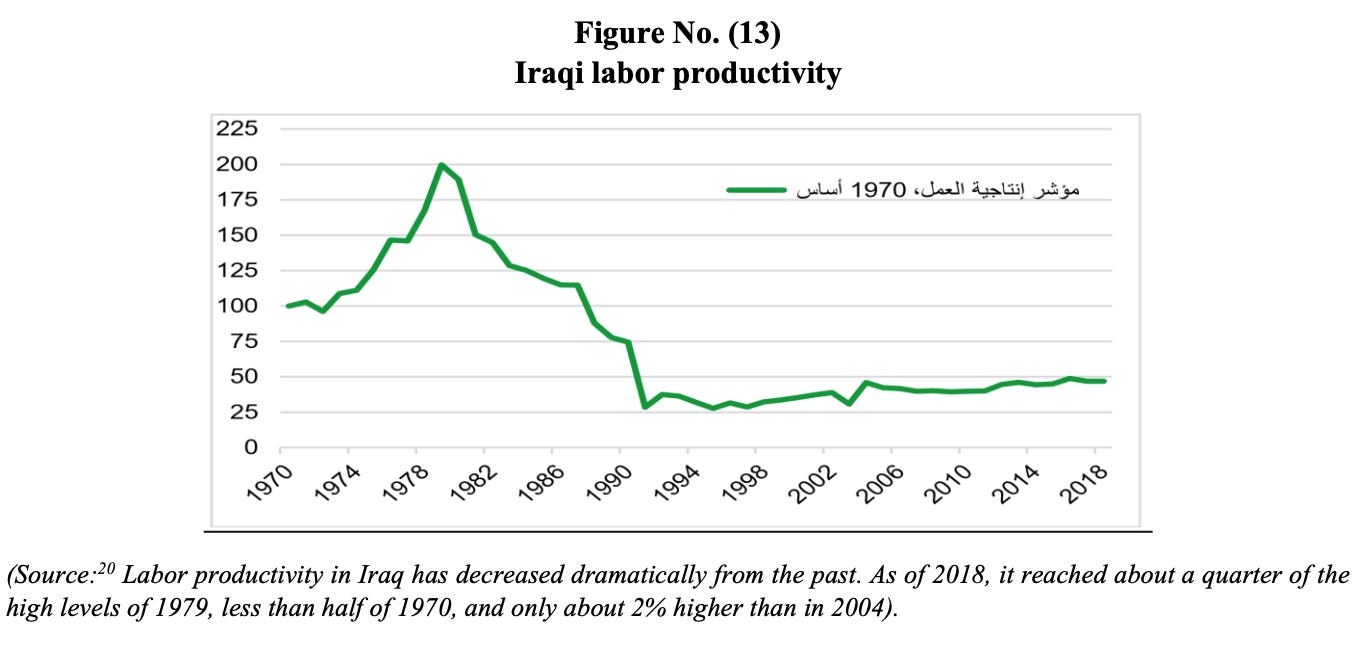 Non-oil tax revenues in Iraq amount to a laughable 1.4% of GDP, compared, for instance, to 27.8 or 30.%% in Angola or Algeria. Other than oil, Iraq has no exports to speak of. Crude oil exports account for 95 % of Iraq’s exports, compared to c. 60% for Saudi Arabia and Iran. Iraq’s labour productivity record over the last half century is one of the more shocking graphs you are ever likely to see.