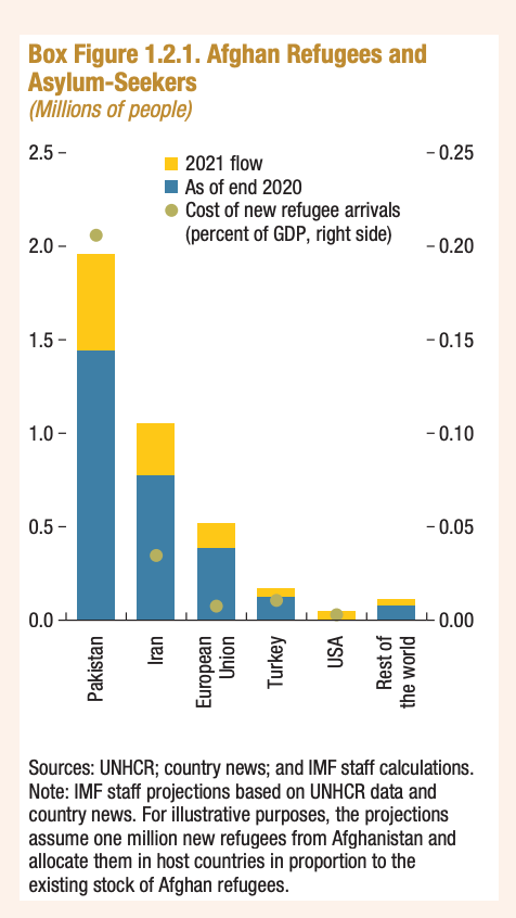 Afghanistan’s immediate neighbors will have no option. Refugees are already beginning to flood into Pakistan and Iran. These are the latest IMF estimates.