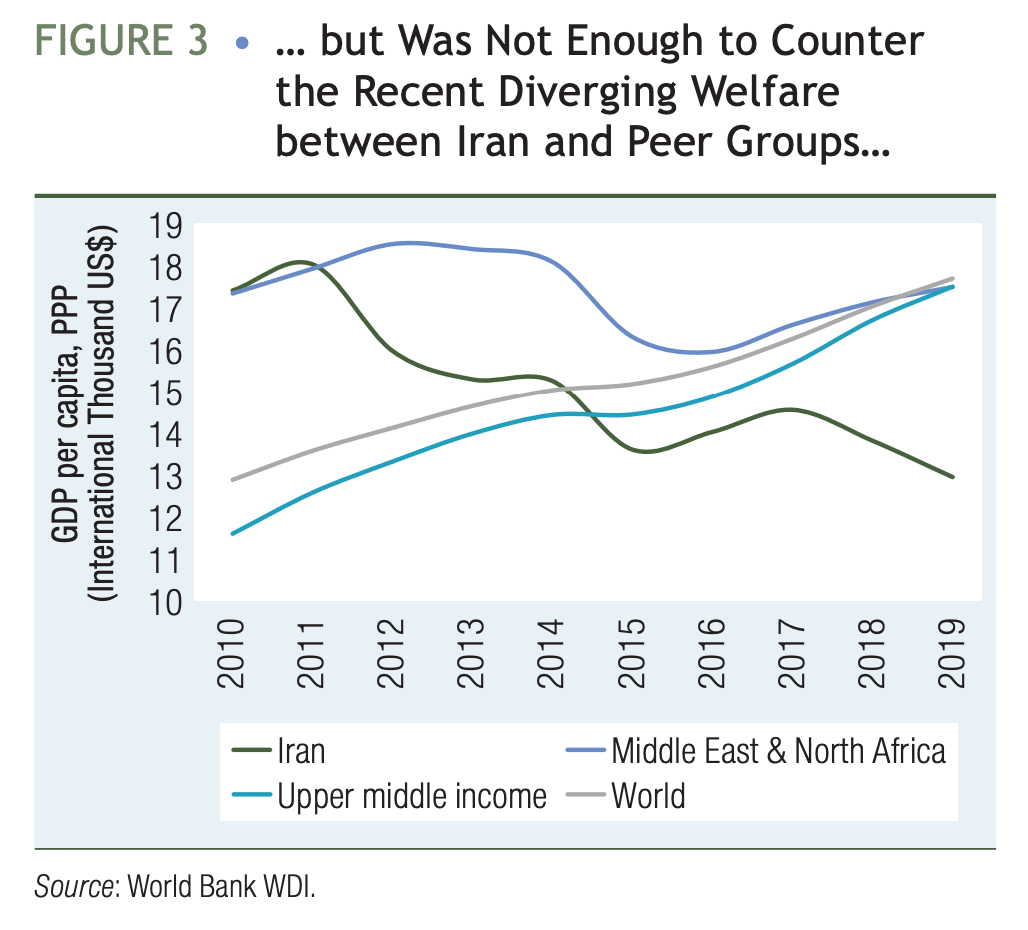 Given its sophistication and population of 80 million, Iran has the potential to be an economy on the scale of Turkey or Saudi Arabia, both of which are members of the G20. That it is not, is a matter of politics, geopolitics and political economy - the state-run political economy of the Islamic Republic and the dramatic pressure of sanctions. If you bring Iran’s economic development over the last decade into close up, the impact of sanctions is clear. In the summer of 2010, the Obama administration and the EU moved towards an aggressive tightening of sanctions. Within a year you can see the impact in Iran’s GDP per capita figures. The nuclear deal of 2015 brought some relief, but with the maximum pressure policy of the Trump administration from 2018 onwards the decline resumed.