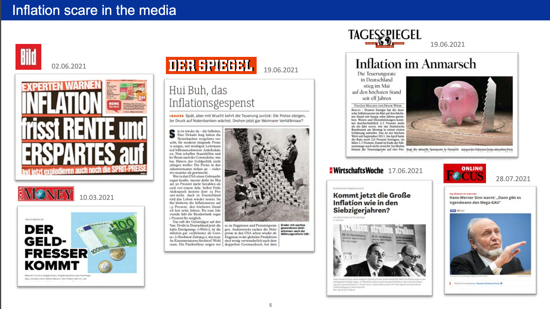 It is therefore important to offer a factual explanation for the recent price increases and an assessment of future risks, especially in Germany where many supposed experts and the media are again rousing people’s fears without explaining the reasons behind the price movements (Slide 5). Allusions are being made to conditions in the Weimar Republic. Comparisons are being drawn to the 1970s, when inflation in Germany was almost 8%. And there are warnings of a “meltdown” and a “runaway train” if interest rates remain low.