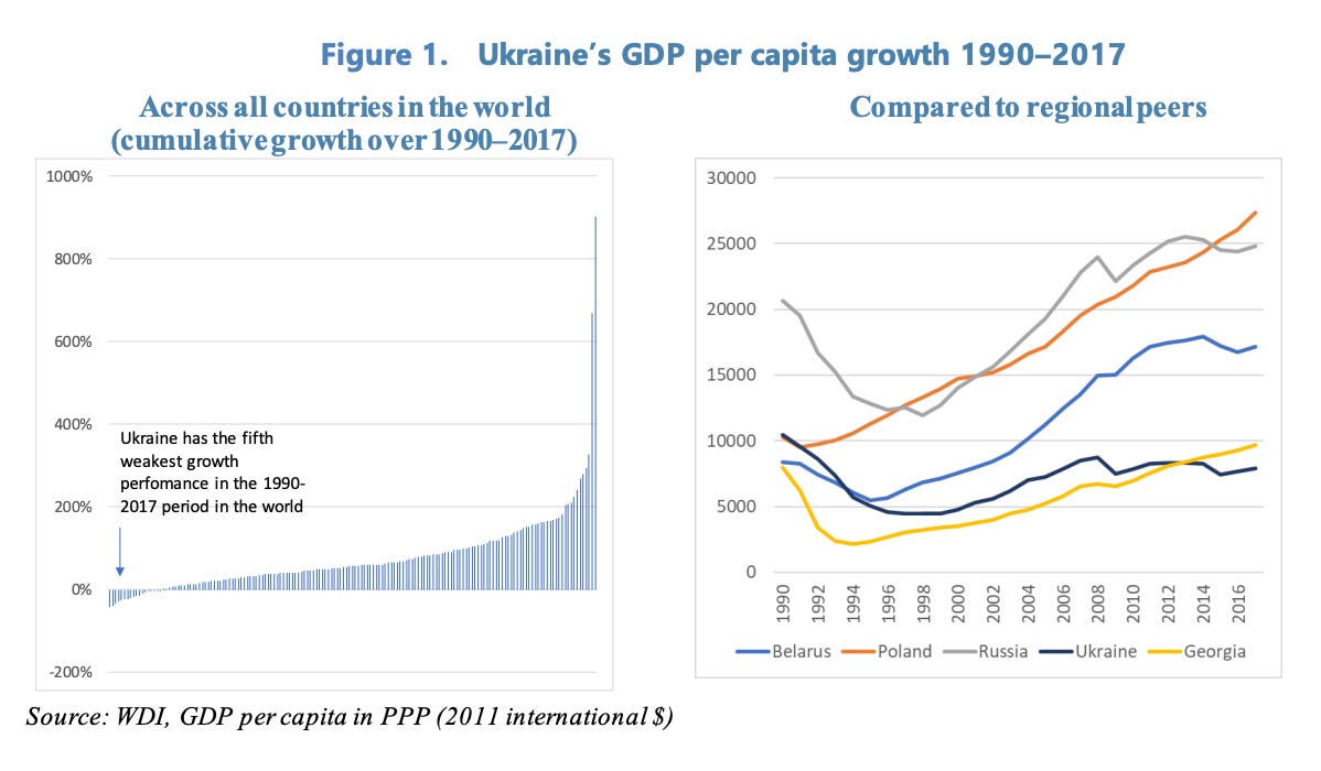Ukraine’s performance between 1990 and 2017 was not just worse than its European neighbors. It was the fifth worst in the entire world. Between 1990 and 2017 there were all told only 18 countries with negative cumulative growth and even in that select group, Ukraine’s performance puts it in the bottom third. Amongst the four countries that delivered less growth for their citizens than Ukraine were the Democratic Republic of Congo, Burundi and Yemen.