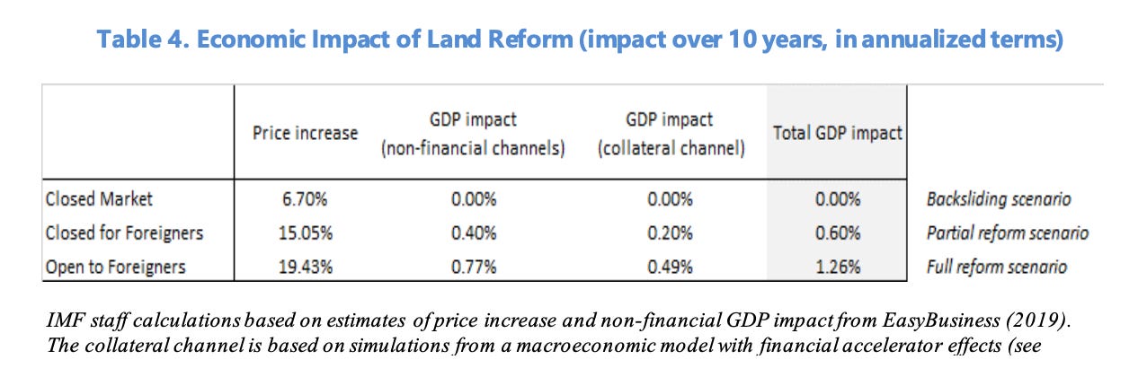 By the World Bank’s calculations it should increase rental income to small landowners by $3 billion every year. It will also give rural residents and small farmers, $24 billion of collateralizable assets that allow them to invest in irrigation, horticulture or non-agricultural small enterprises. In additional local taxation the World Bank estimates $2 billion annually.