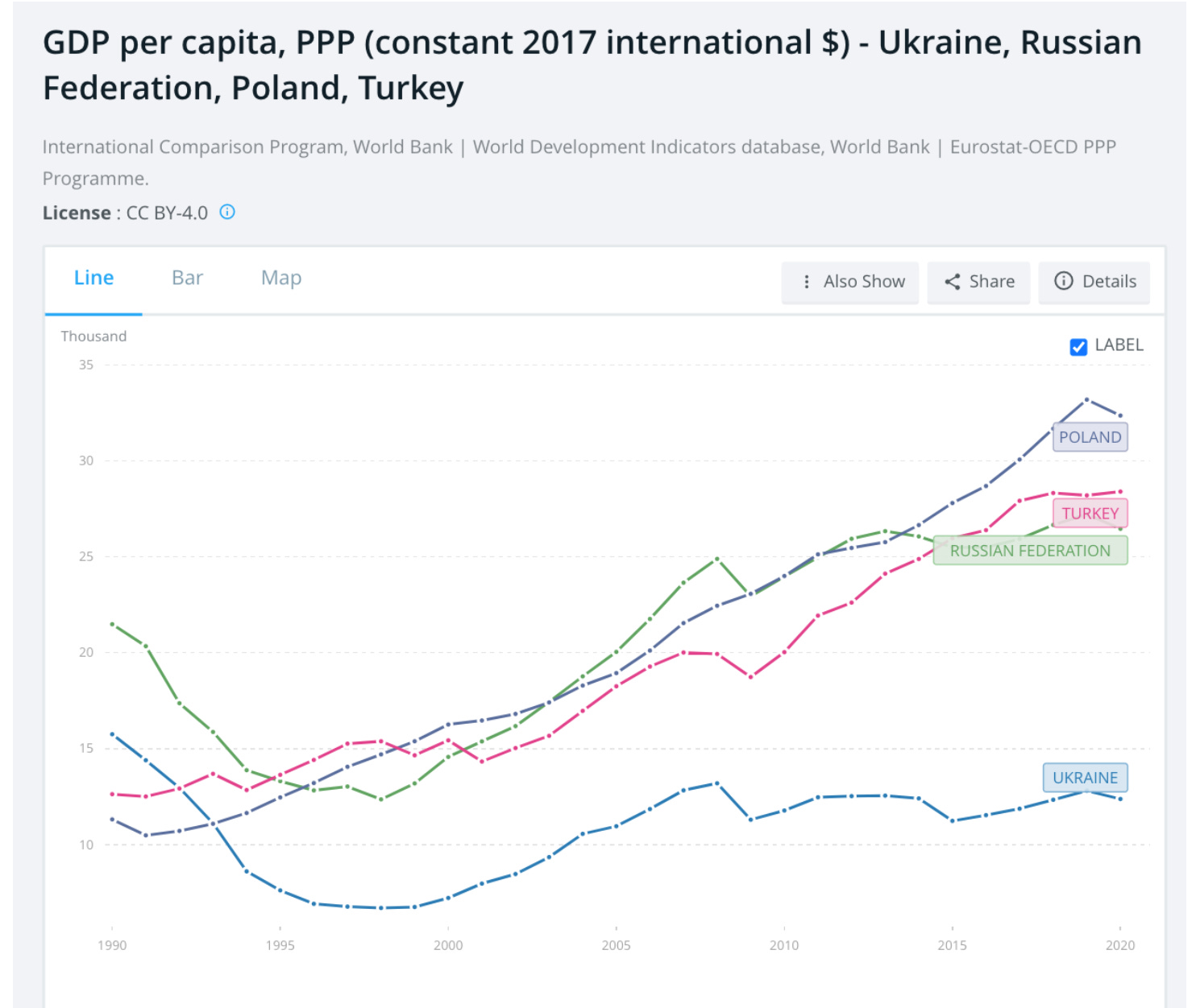 In any case, after flashing up the GDP data on the NYU panel, I was seized by a nagging doubt. Could these World Bank figures for GDP per capita really be correct? They are so extreme? Was there something wrong ? Was I - worst case - an unwitting organ of black propaganda against Ukraine? On the NYU panel the talk turned to “failed states”, a term vigorously rejected by those who know Ukraine’s politics far better than I do. After another 24 hours of hunting I am both happy and sad to report that the data do seem to stand up. Indeed, the situation is more extreme even than I portrayed it. In my chart I compare Ukraine to Poland, Turkey and Russia. A recent IMF paper places Ukraine in global perspective.