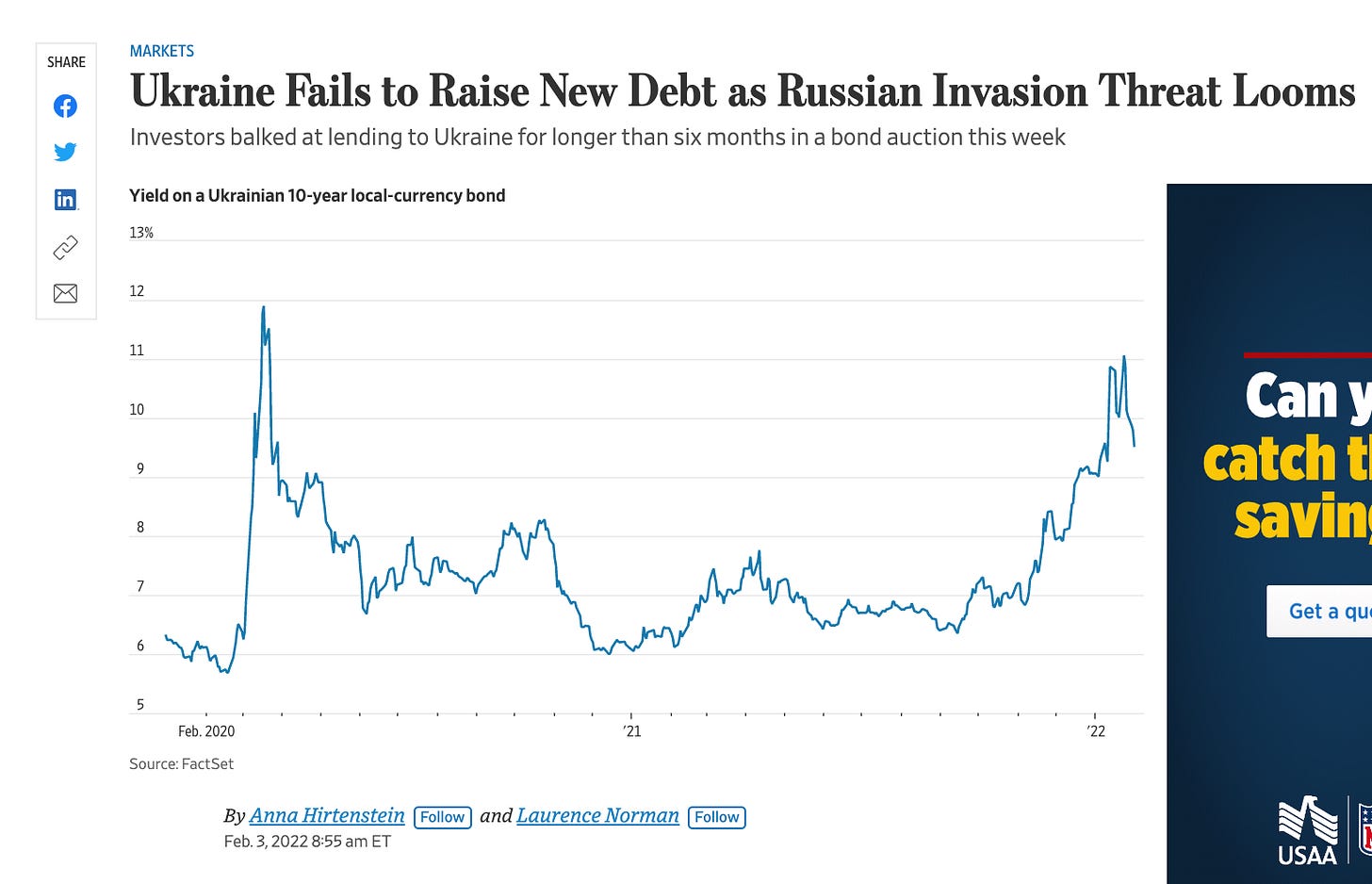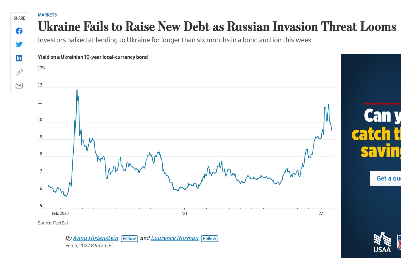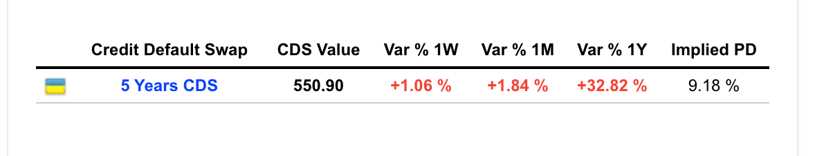 Credit Default Swap insurance on Ukraine’s debt stand at 550 i.e. you pay 5.5% on top of any interest to insure debt. That is bad. It makes new borrowing unaffordable. But it is not yet apocalyptic. Let us hope the markets are right.