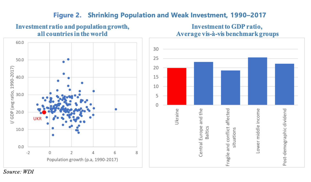How do we explain this? The IMF authors point to Ukraine’s uniquely unpromising combination of low investment and declining population.