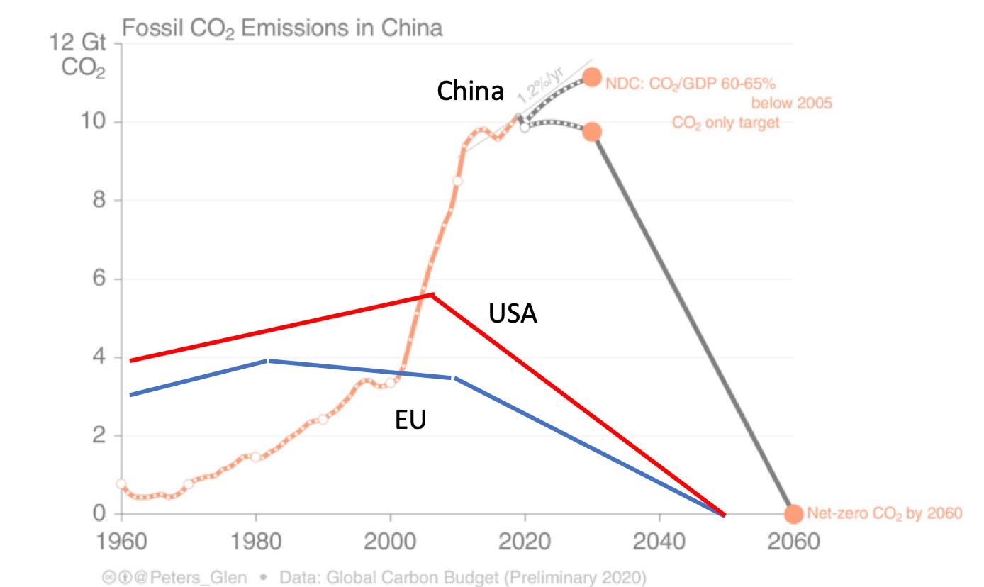 Though the Western polluters have set their sights on 2050 and their emissions peaked long ago, the trajectory that China has set its sights on is, is not less but far more ambitious than anything envisioned in the West. Heuristically the net zero paths of China, the USA and the EU might be compared as follows.