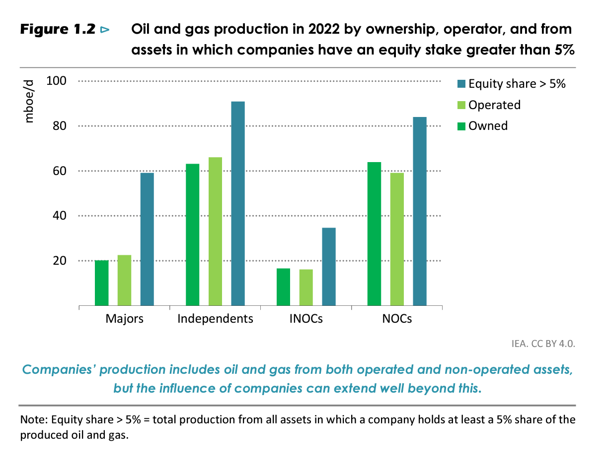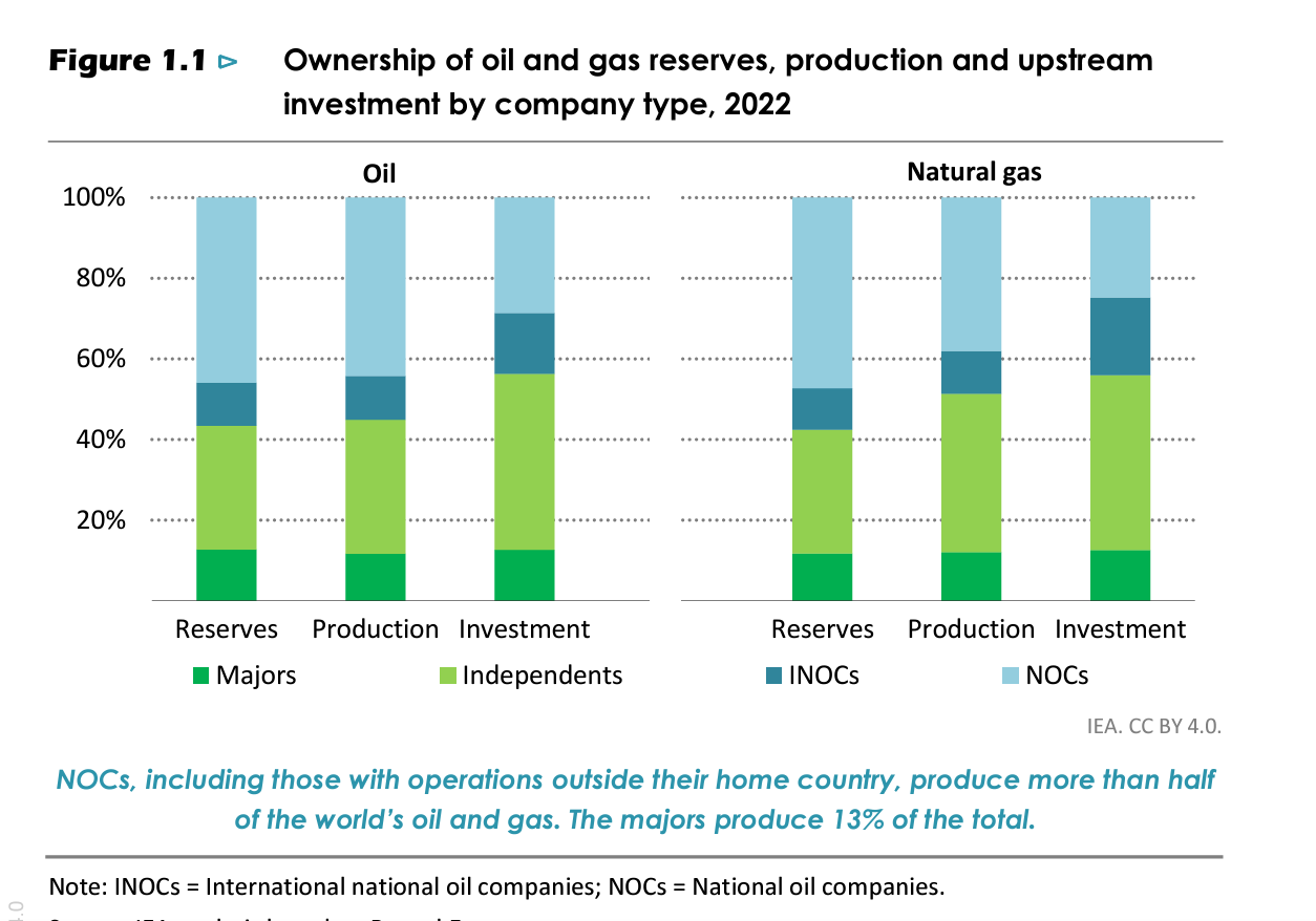To start with, as the IEA comments, it is important to get clear what the oil and gas industry consists of. The industry is vast, employing 12 million people and generating free revenue of roughly $3.5 trillion, which is split between government taxation (50%), reinvestment (40%) and dividends (10%). In the West, notably in the US and Europe, we tend to think of the energy industry as consisting of “oil majors”. Giant private corporations like Exxon. But that is an outdated view, today the 7 global oil majors “hold less than 13% of global oil and gas production and reserves. National oil Companies (NOCs) account for more than half of global production and close to 60% of the world’s oil and gas reserves.”