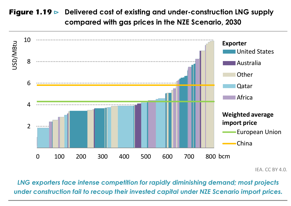The projects that will hurt the most are the rash of recently announced new LNG capacity, notably in Africa. Their cost base is well above the prices that the IEA expects for LNG by the 2030s. As the IEA demonstrates, low-income high-cost producers like Mozambique in gas or Angola and Nigeria in oil, have a future as major fossil fuel producers, only if they are accorded special preference in the process of contraction.