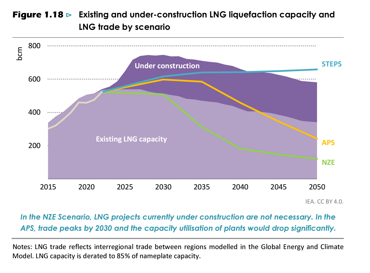 Structural changes in the energy sector are now moving fast enough to deliver a peak in oil and gas demand by the end of this decade under today’s policy settings. After the peak, demand is not currently set to decline quickly enough to align with the Paris Agreement and the 1.5 °C goal. But if governments deliver in full on their national energy and climate pledges, then oil and gas demand would be 45% below today's level by 2050 and the temperature rise could be limited to 1.7 °C. If governments successfully pursue a 1.5 °C trajectory, and emissions from the global energy sector reach net zero by mid-century, oil and gas use would fall by 75% to 2050. …. In the Announced Pledges Scenario (APS), oil and gas demand decline by around 2% each year on average to 2050 (to 55 mb/d and 2 400 bcm) and in the Net Zero Emissions by 2050 (NZE) Scenario they fall by more than 5% each year on average to 2050 (to 24 mb/d and 920 bcm).