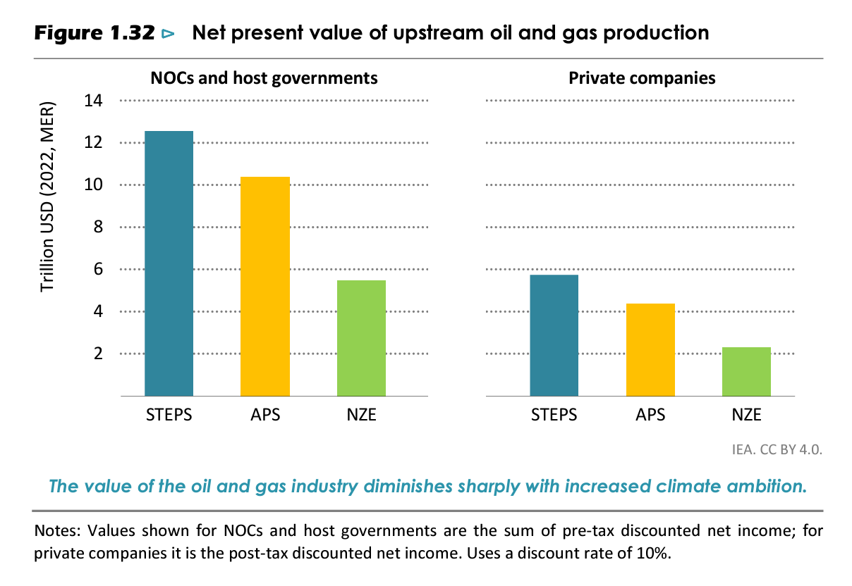 As the IEA comments, if “expectations are that demand and prices follow a scenario based on today’s policy settings, that would value today’s private oil and gas companies at around USD 6 trillion. If all national energy and climate goals are reached, this value is lower by 25%, and by 60% if the world gets on track to limit global warming to 1.5 °C.” Due to their much larger reserves, the losses of the National Oil Companies will be proportionally heavier.