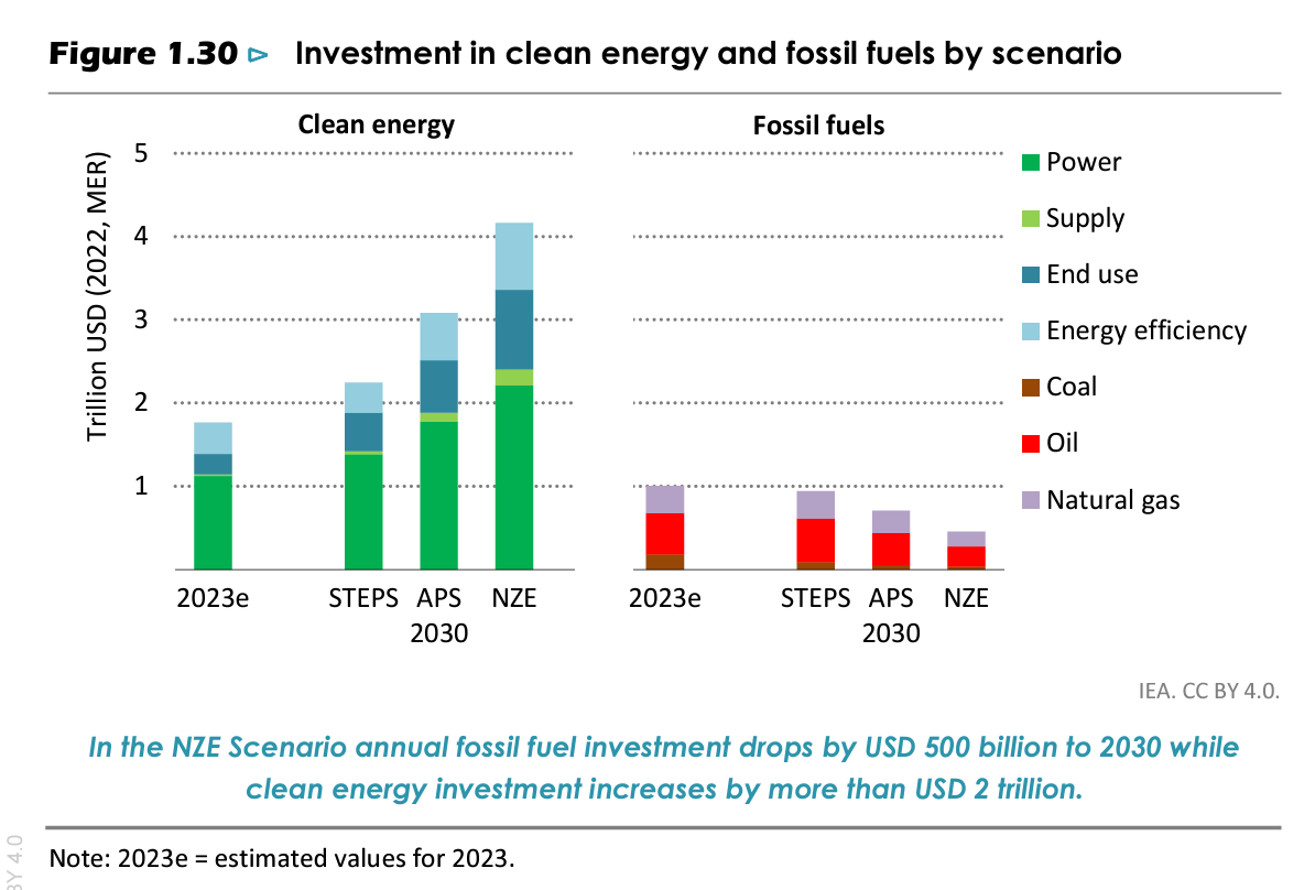 Total energy investment in 2023 is estimated to be USD 2.8 trillion. Of this, around USD 1.8 trillion will be invested in clean energy (including EVs and the like), and USD 1 trillion in oil, gas, and coal (including extraction, refining, transmission and distribution, and power plants that use these fuels).