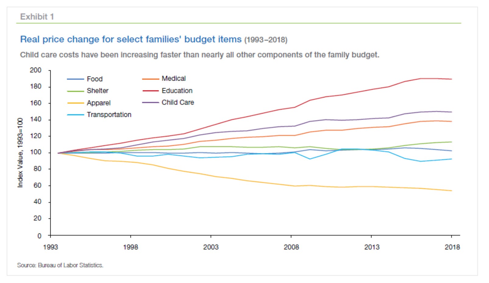 Private childcare in the United States is not just expensive, like education it has risen in price relative to all other expenses of the typical American family.