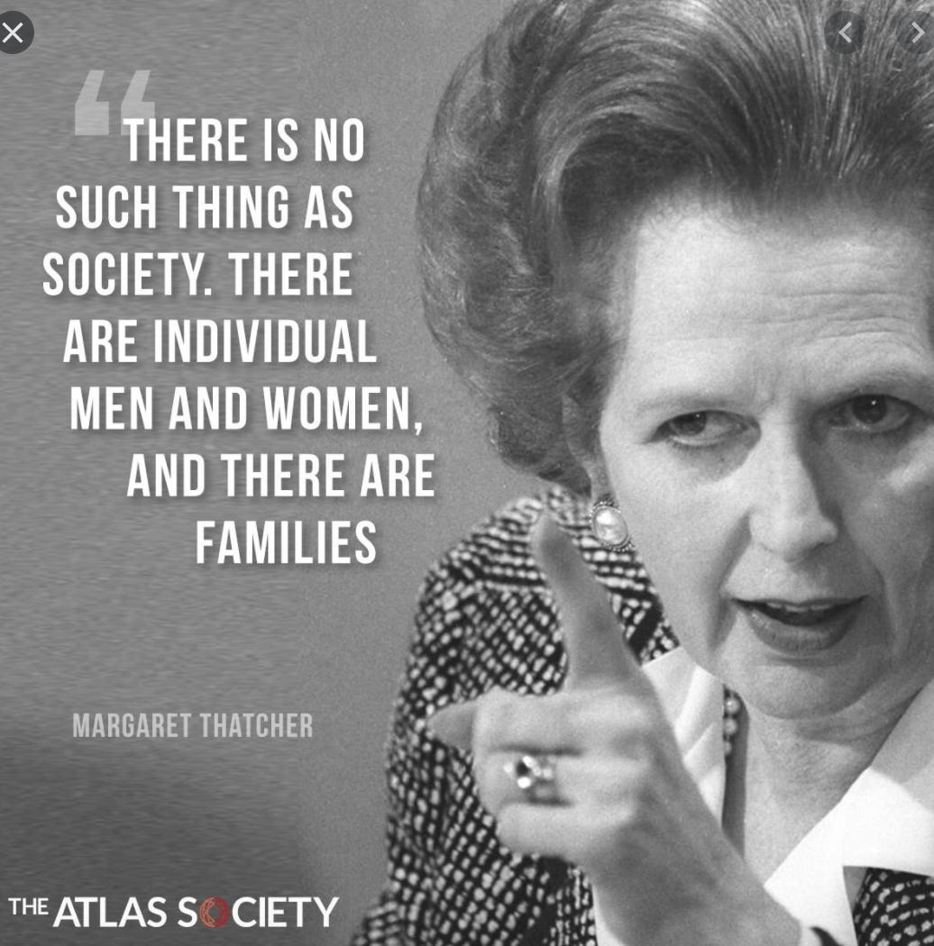 For Thatcher, famously, there was no such thing as society. The alternative to society, however, was not simply the individual, but the family. As Thatcher herself put it: “Who is society? There is no such thing! There are individual men and women and there are families.”