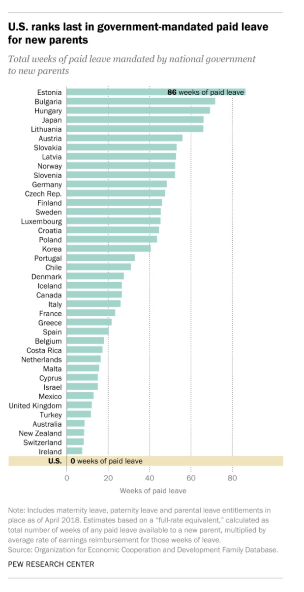 When it comes to basic entitlements in most advanced economies, the United States flouts conventional civilizational standards. No federal laws require paid leave in the U.S. The U.S. is the only wealthy country that does not legally require parental leave. Public childcare provision is grossly inadequate.