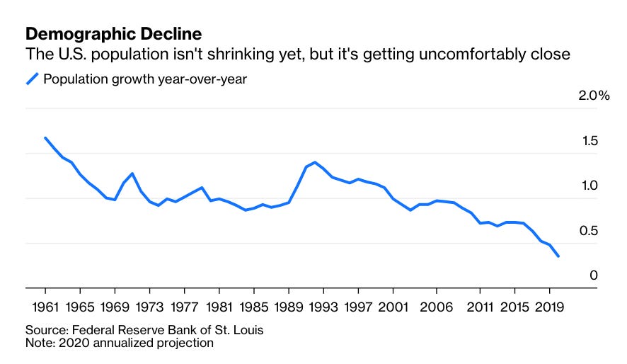 Population expansion drives investment and growth. America’s dynamic demography gave American business a rapidly expanding market. Now, as Noah Smith remarks in a recent Bloomberg column, the US is losing its “population advantage”.