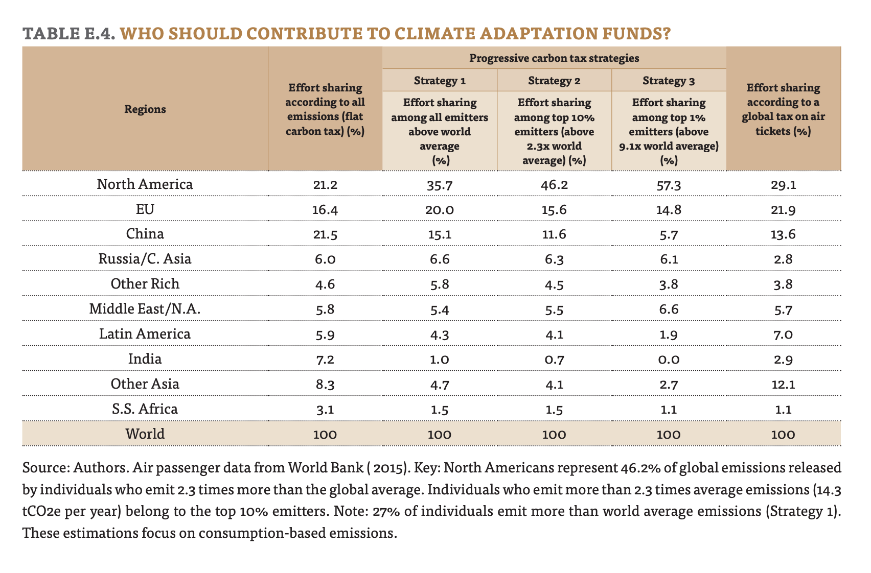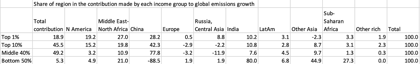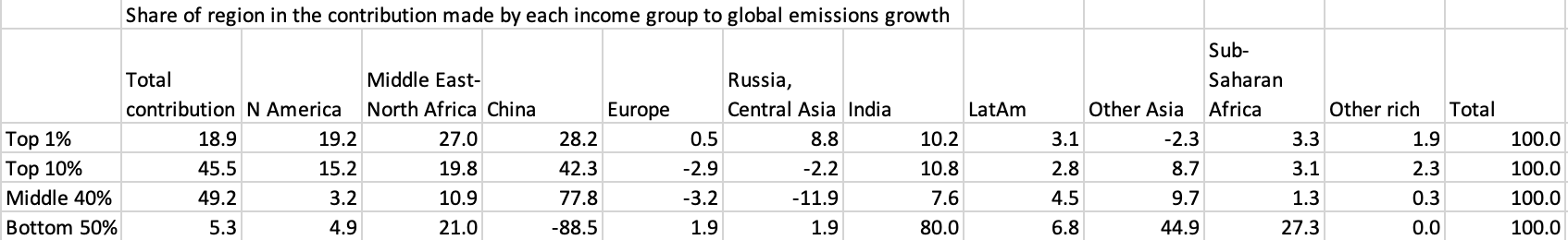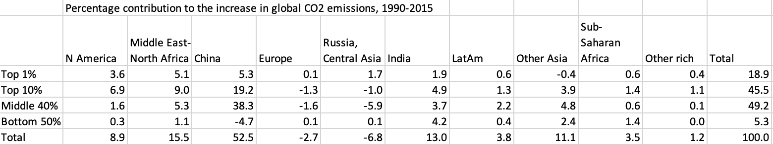 If we ask how far each region contributes to the increase in emissions by each income class, the conclusions are similarly stark. Of the increase in global emissions of 18.9% contributed by those belonging to the top 1% of global incomes, North Americans accounted for 19%, residents of MENA 27% and China 28.2%. The negative numbers in some cells of the table reflect the way in which the growth of the Chinese economy has lifted a large part of its population out of the bottom 50 percent of the global distribution.