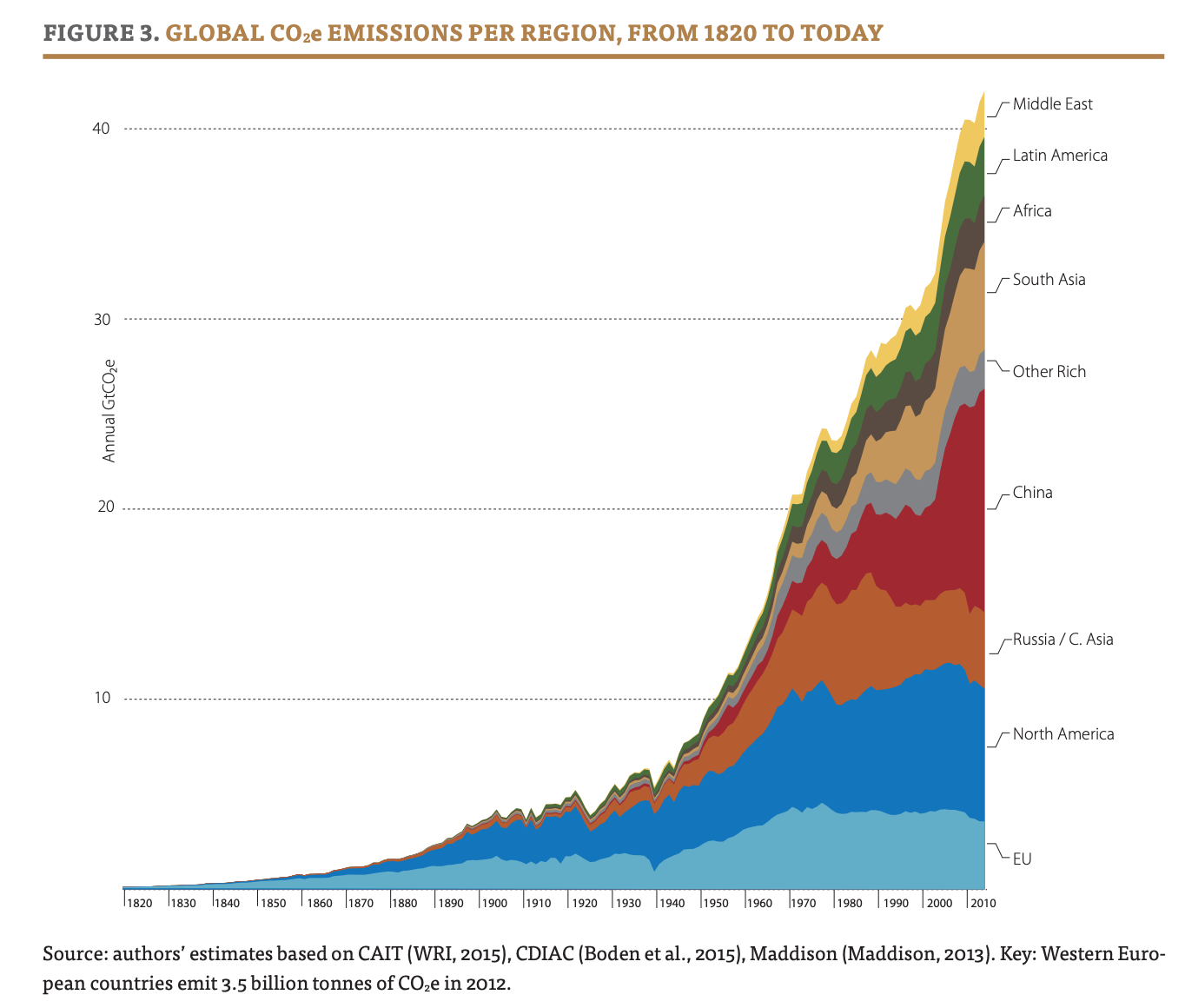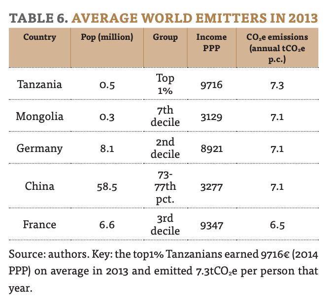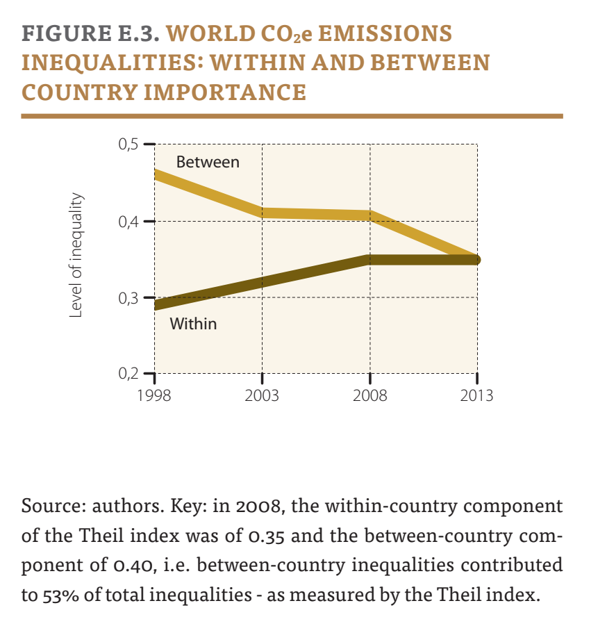 In 2015, in time for the Paris climate talks, Thomas Piketty brought the apparatus of global inequality statistics to bear on the emissions problem. Together with Lucas Chancel he published a study. which adopted Branko Milanović's approach to the global income distribution and mapped it onto CO2 emissions.