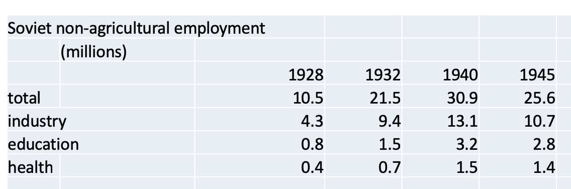 The growth in the industrial workforce was dramatic. Even more spectacular was the surge in education and health. As Sheila Fitzpatrick pointed out long ago, the Soviet Union educated its population not just ideologically.