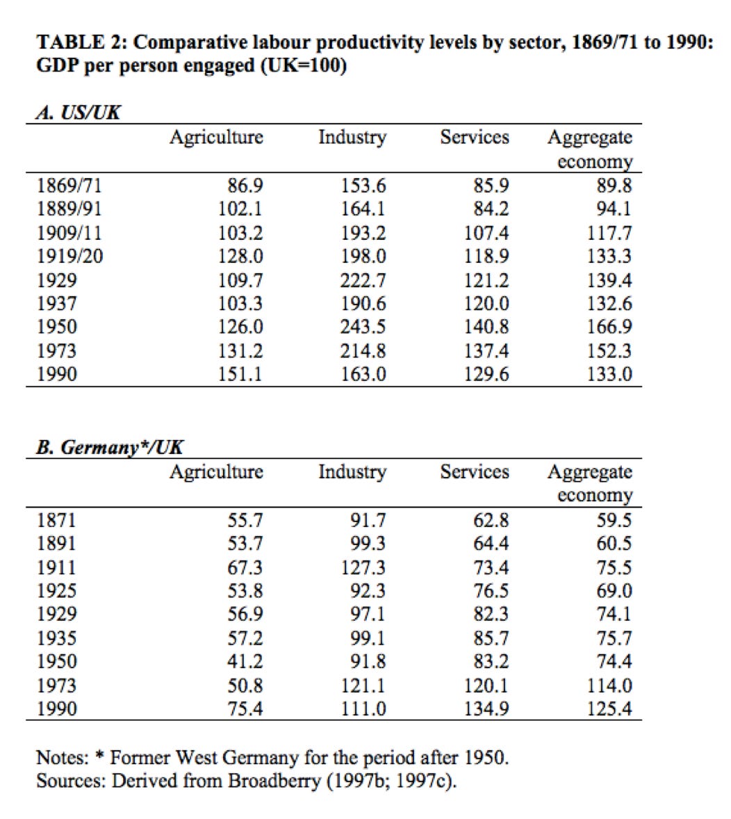 The UK had no advantage over Germany in industrial productivity. But thanks to Britain’s early industrialization and the end of small-holding peasant agriculture, the UK’s labour force was far more efficiently allocated than that of Germany.