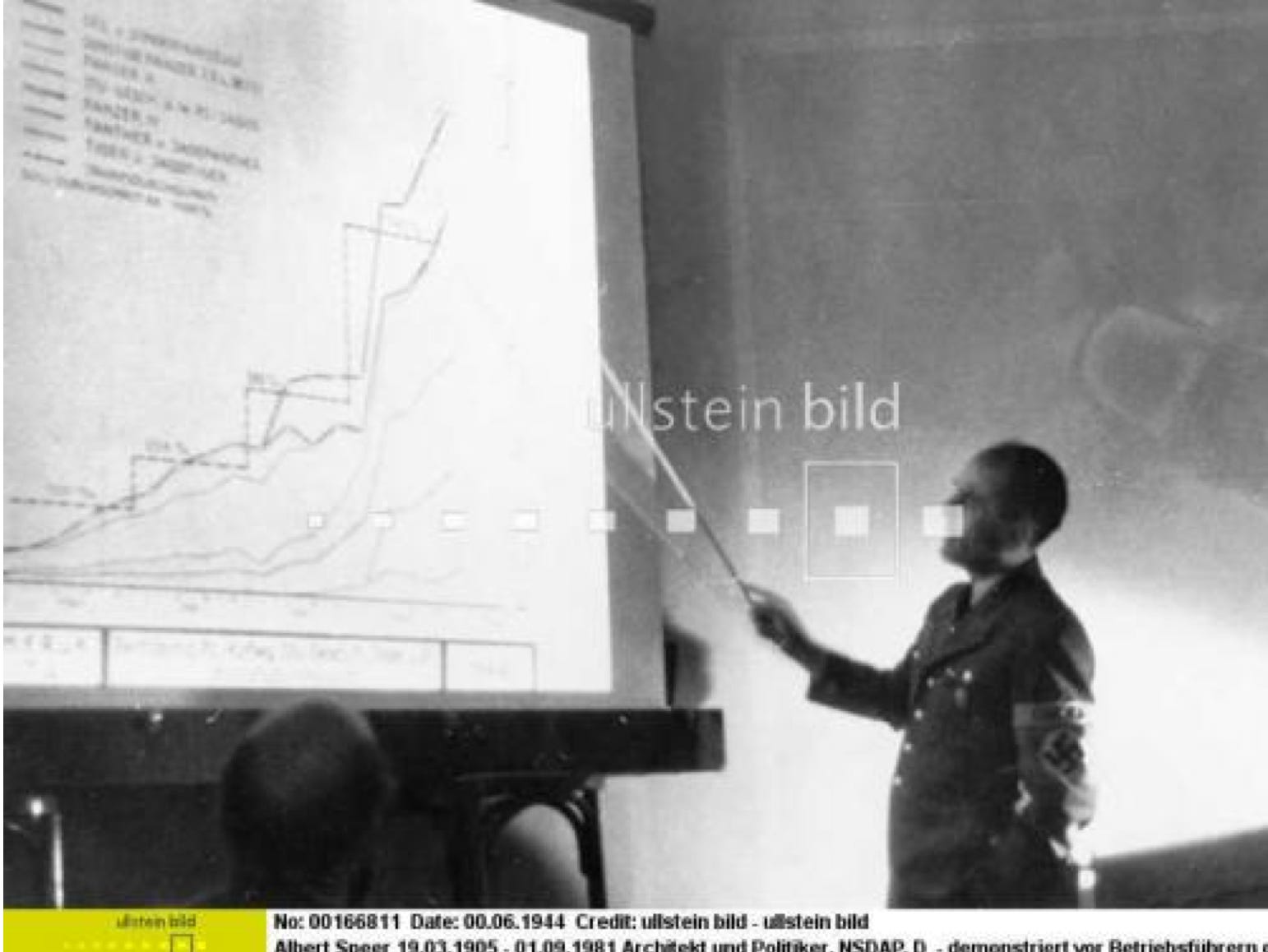 Sereny and others have exposed his knowledge of the Holocaust. What preoccupies me more is his voluntarism and the process through which the man posing as technician becomes the enabler of irrational and violent action. I am haunted, in particular, by an image of Albert Speer giving a slide show presentation on the upward surge of the armaments production index. It dates to June 1944, at the moment when the front in the East was being torn open by Operation Bagration and the Allies were entrenching their beach head in Normandy and yet here is Speer preaching the armaments miracle.