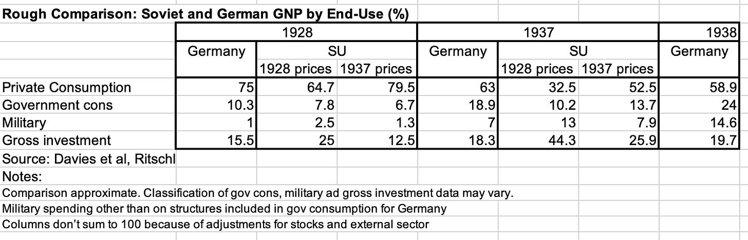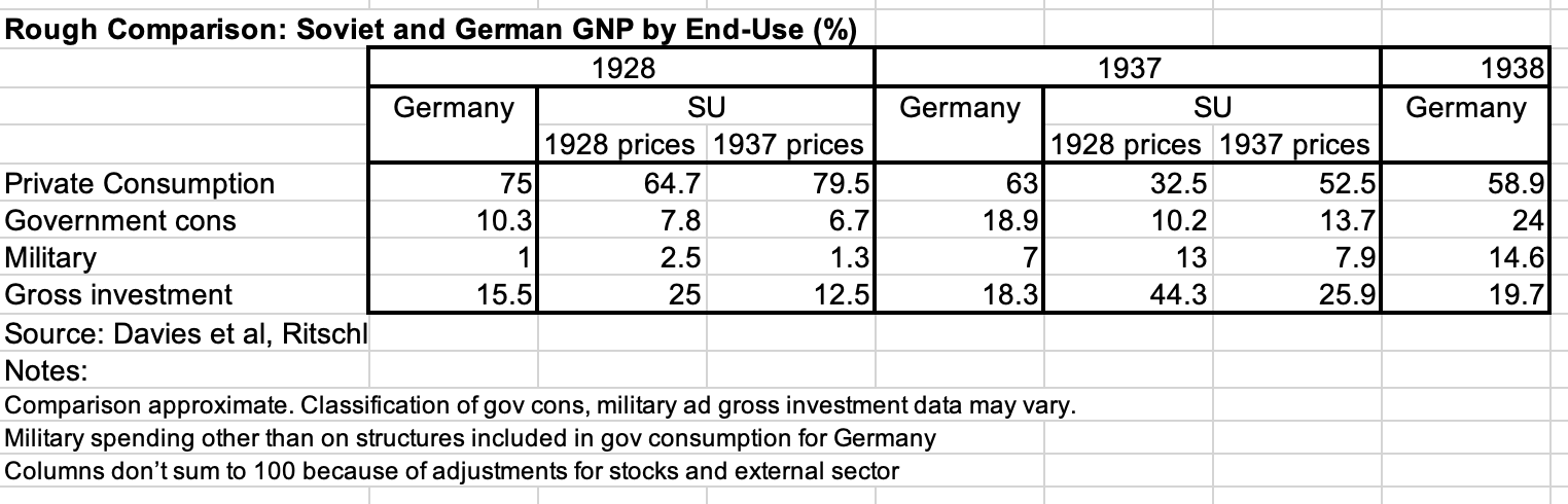 These data come with a BIG health warning. They abound with classificatory and accounting issues. But they do give an indication of the truly dramatic capacity of the Soviet regime to squeeze consumption in favor of state priorities. The fact that investment is smaller when measured in 1937 prices, when industrial goods were far more abundant, is indicative of how huge the transformation was.