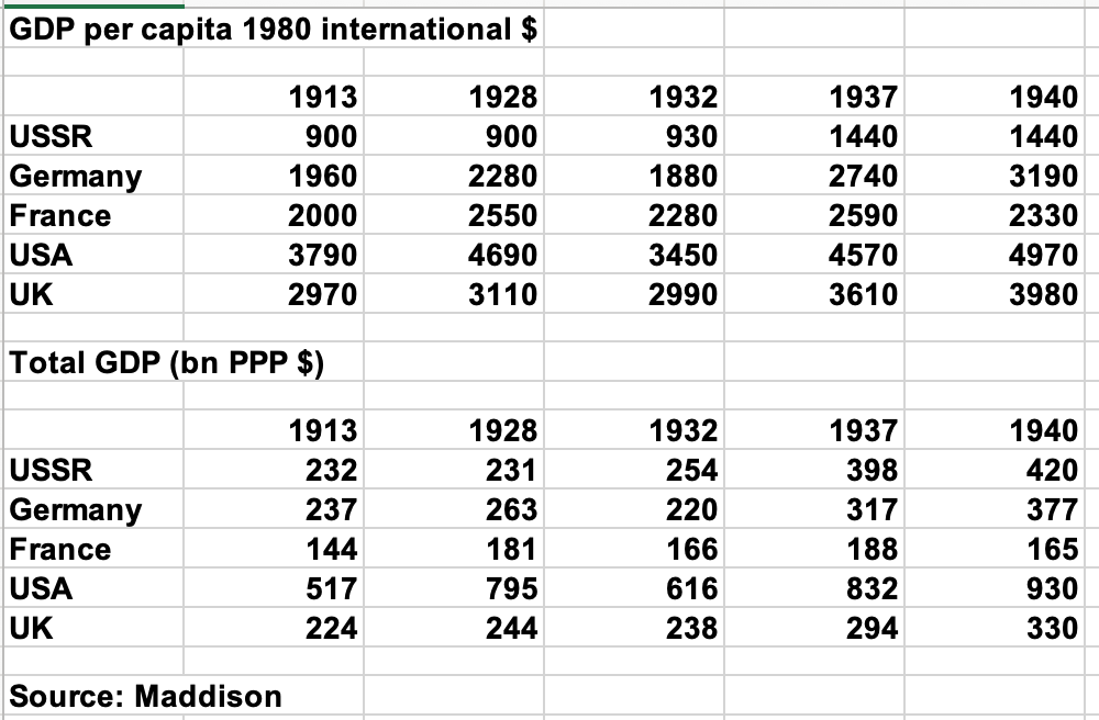 Joe Maiolo has given us a rich narrative account of the arms race of the 1930s. But there isn’t, as far as I’m aware, a sustained comparison of Soviet and German economies in the 1930s. Maddison’s GDP data have the total size of the Soviet economy overtaking that of Germany between 1913 and 1940.