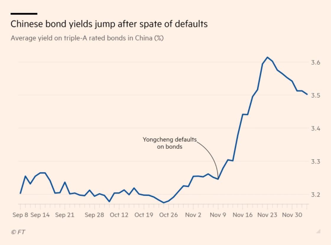 There are mounting worries about the debt of China’s state-owned enterprises (SOE). A wave of defaults has been triggered by that of coal company, Yongcheng. Its ill-fated expansion into coal-derived chemicals, led to a default in November that threatened a doom-loop with the finances of Henan regional government and delivered a shock that has rocked entire Chinese SOE bond market. Yields have surged.