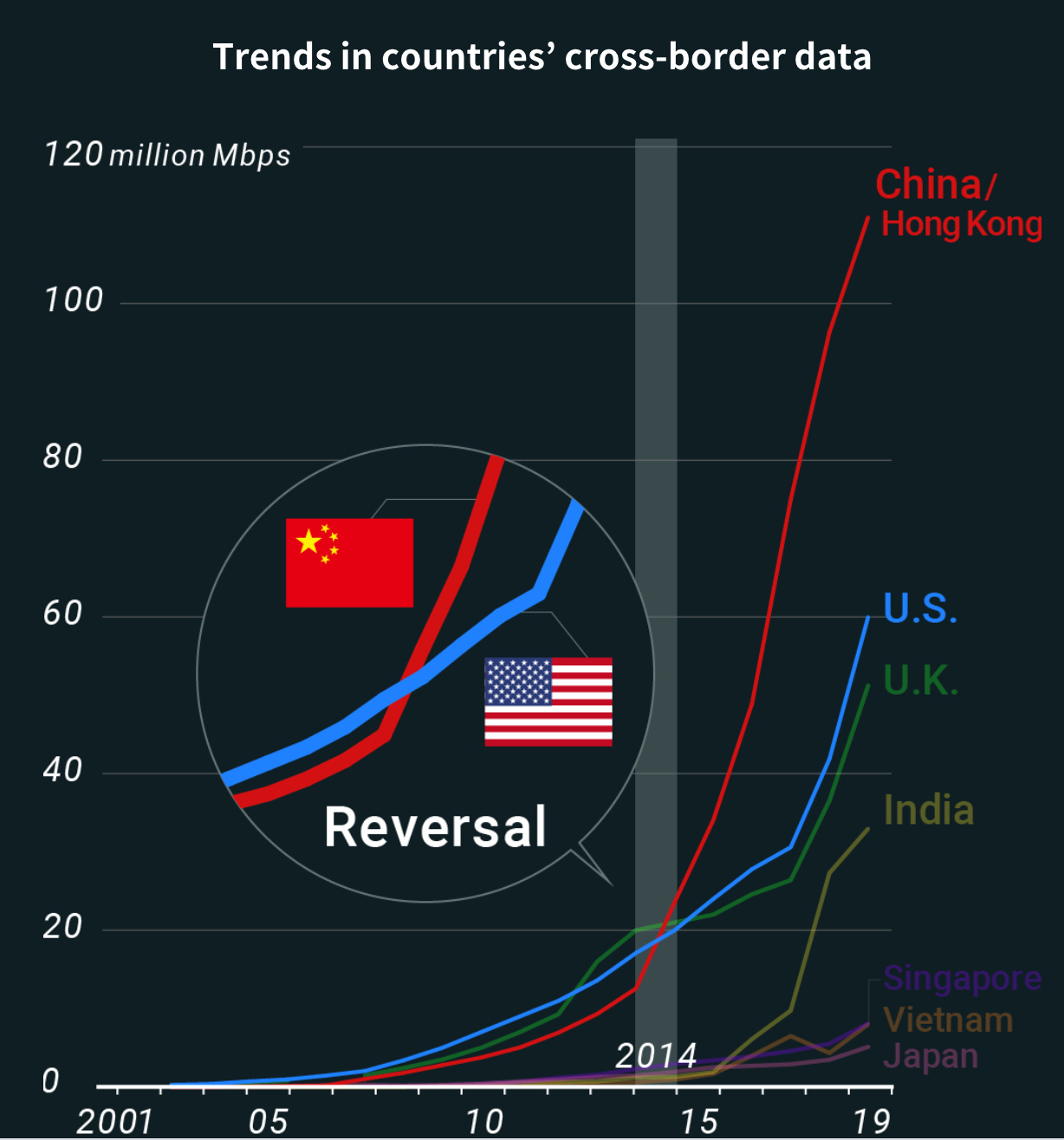 It isnt just the old economy in which China is the main driver of growth. China’s great data firewall and emergence of “splinter net”, has not prevented China/Hong Kong becoming by far the largest nodes in global data networks. China/Hong Kong crossborder traffic is twice that for US and it continues to boom.
