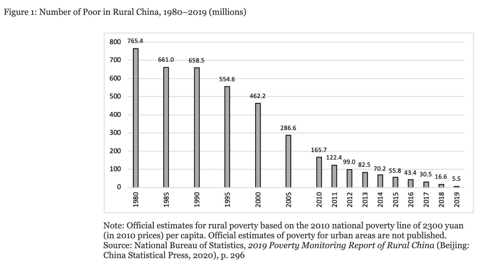 On the basis of this growth, Beijing is projecting the end of poverty in China, at least according to the official statistics. Estimates for rural poverty based on the 2010 national poverty line of 2300 yuan (in 2010 prices) per capita show a spectacular decline. That is a world historic event in its own right.