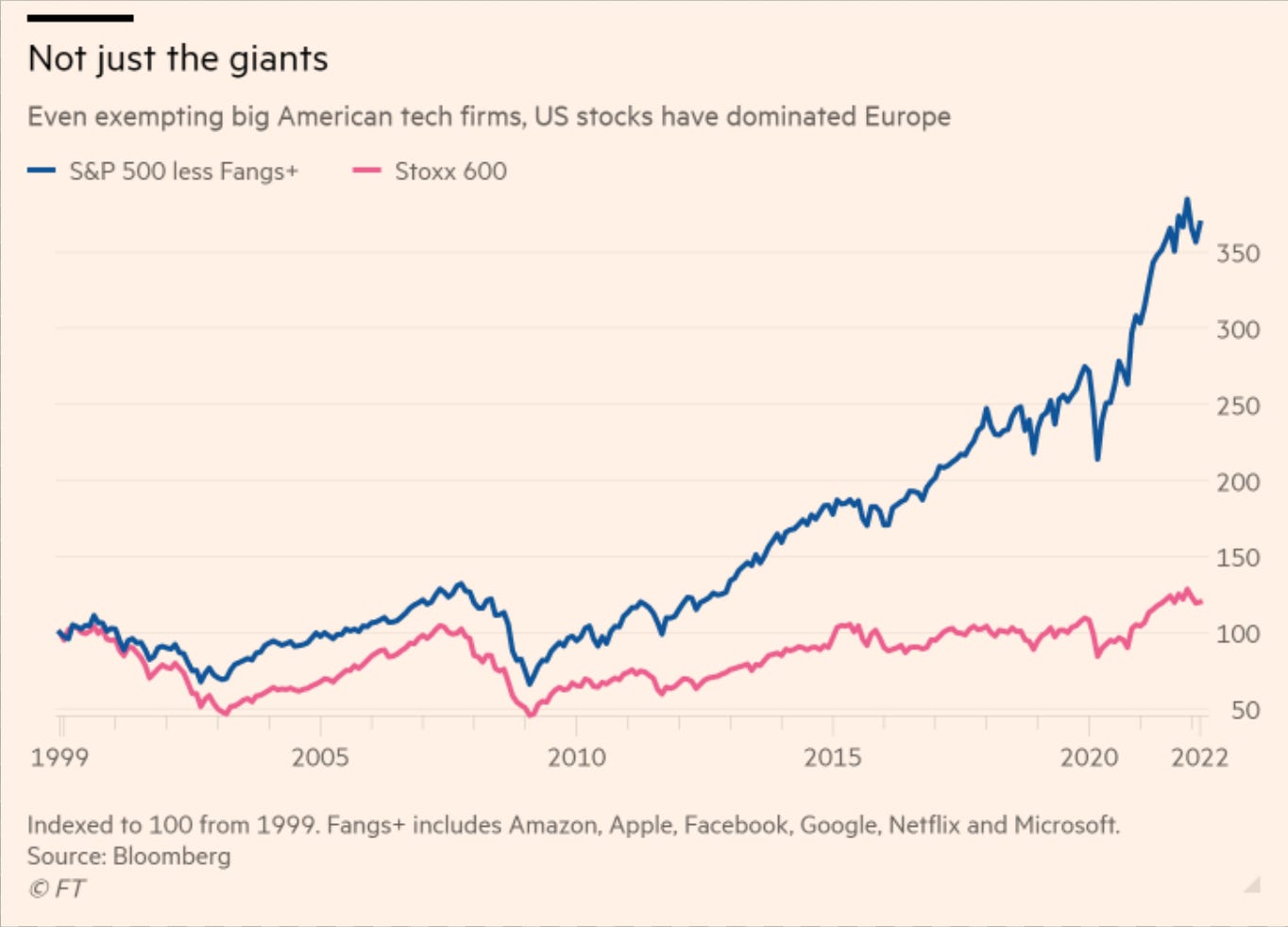 When markets people like us think about Europe, they tend to think about charts like this, which shows the relative performance of US and European stock indices (we have excluded the global tech giants that have led the US market, to make the comparison more representative):