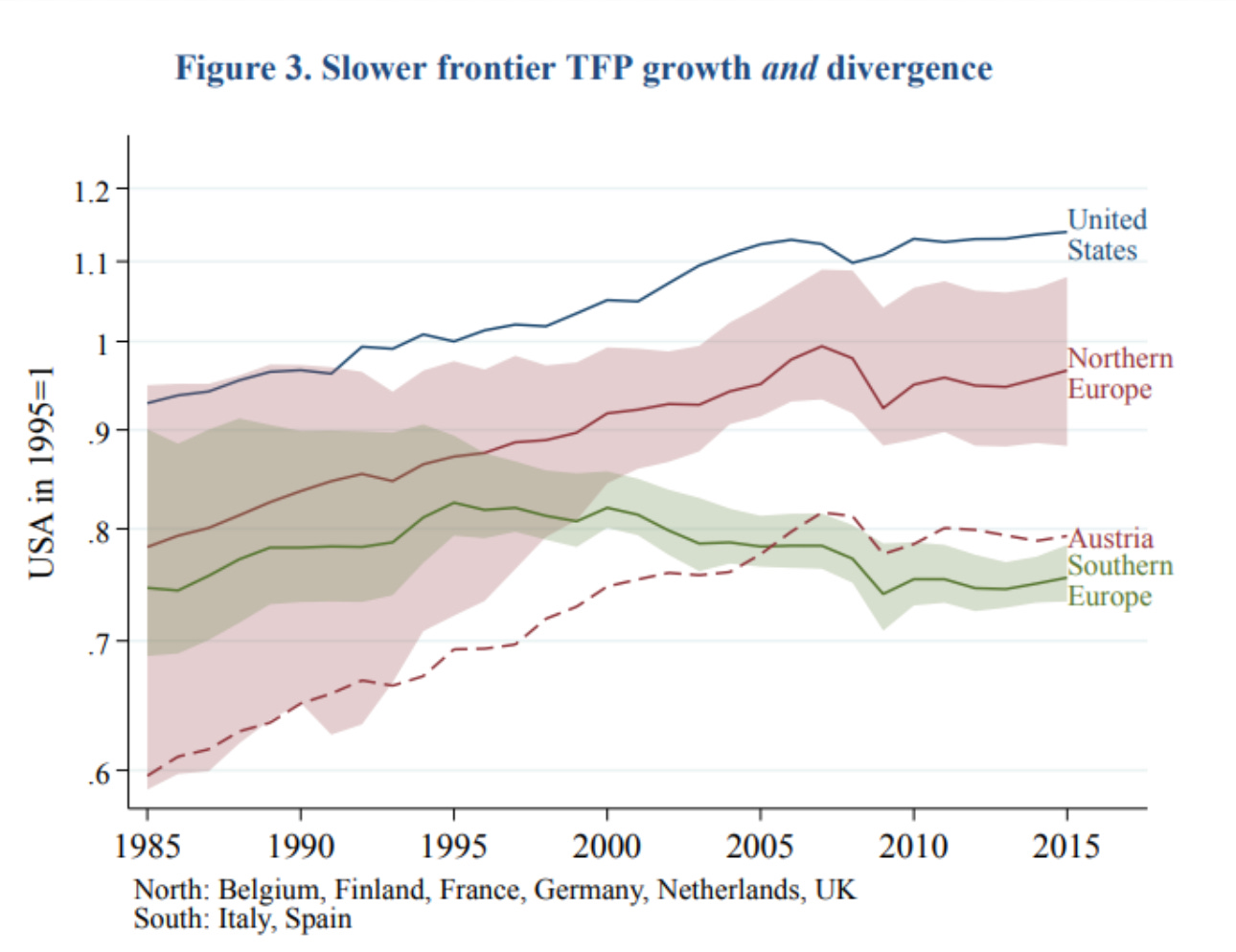 Here is total factor productivity growth, showing how peripheral countries have dragged on Europe, while even in northern Europe the gap with the US has persisted: