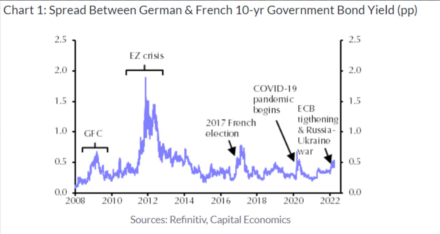 The spread between French (as well as Italian and Spanish) yields and German ones have been widening for several months. As we discussed here, we think that mainly reflects the ECB’s intention to tighten monetary policy and its muddled message around how, and to what extent, it plans to support “periphery” bond markets in future…But over the past few days, the yields of French bonds have risen by more than those of Spanish ones, and almost as much as Italian ones. In previous episodes of ECB-driven spread widening, French yields rose by less…In addition, the share prices of the major French banks have fallen sharply over the past week (and by significantly more than those of other EU banks). So, “Le Pen risk” appears to be making a comeback