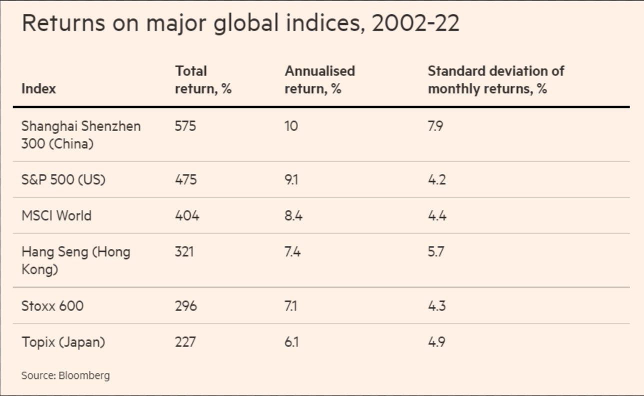 Focusing for just a moment on the stock market, mainland Chinese equities have performed well relative to the basic global alternatives over the long run. Here are 20-year total and annualised returns, all in dollar terms, through the end of February: