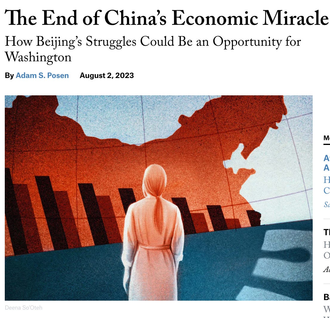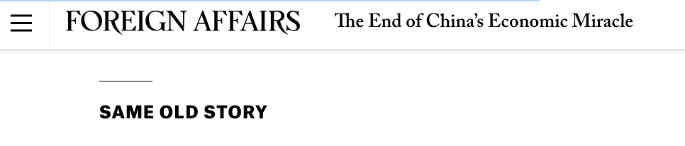 What might be called the “authoritarian impasse” (on second thoughts I’ve amended the title of Part I), an interpretation forcefully articulated by Adam Posen in Foreign Affairs, argues that China is now suffering the fate that is, in due course, inescapable for any any authoritarian regime. Hence the telling title - “the end of China’s miracle”.
