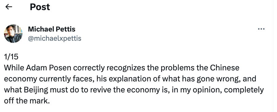 I don’t want to repeat Pettis’s views in detail here. Everyone interested in China should follow his daily commentary which is - every time! - rooted in his analysis of China’s structural political economy. It really is a uniquely persistent and perceptive campaign of analysis and persuasion. What I want to do is to add value (hopefully) by drawing out the grounds on which Pettis and Posen disagree.