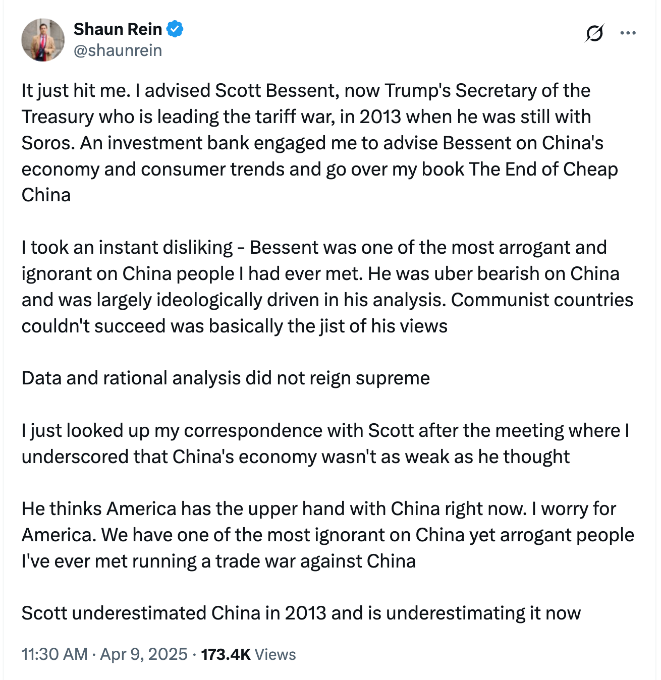 A radical move to decoupling was always going to be a shock. It was always going to hurt the markets. This way, 125 percent tariffs on China almost come as a relief.
