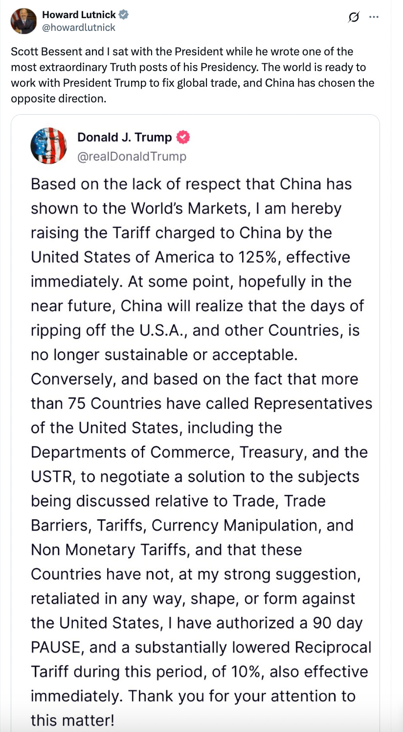 The double action of simultaneously lowering tariffs for most of the world (we think) and arbitrarily raising to them an eye-watering 125 percent for China, added a new twist to the rollercoaster of Trump’s trade policy.