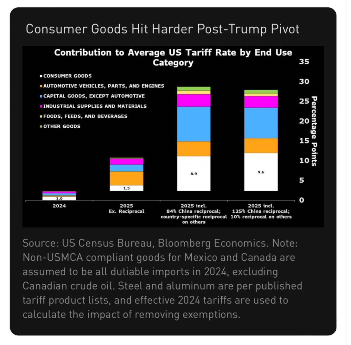 We calculated that post Trump “put” today, the tariff mix is actually worse —China exports more consumer goods to US than other countries, so boosting that (to 125%) relative to others will boost the hit to consumption goods.