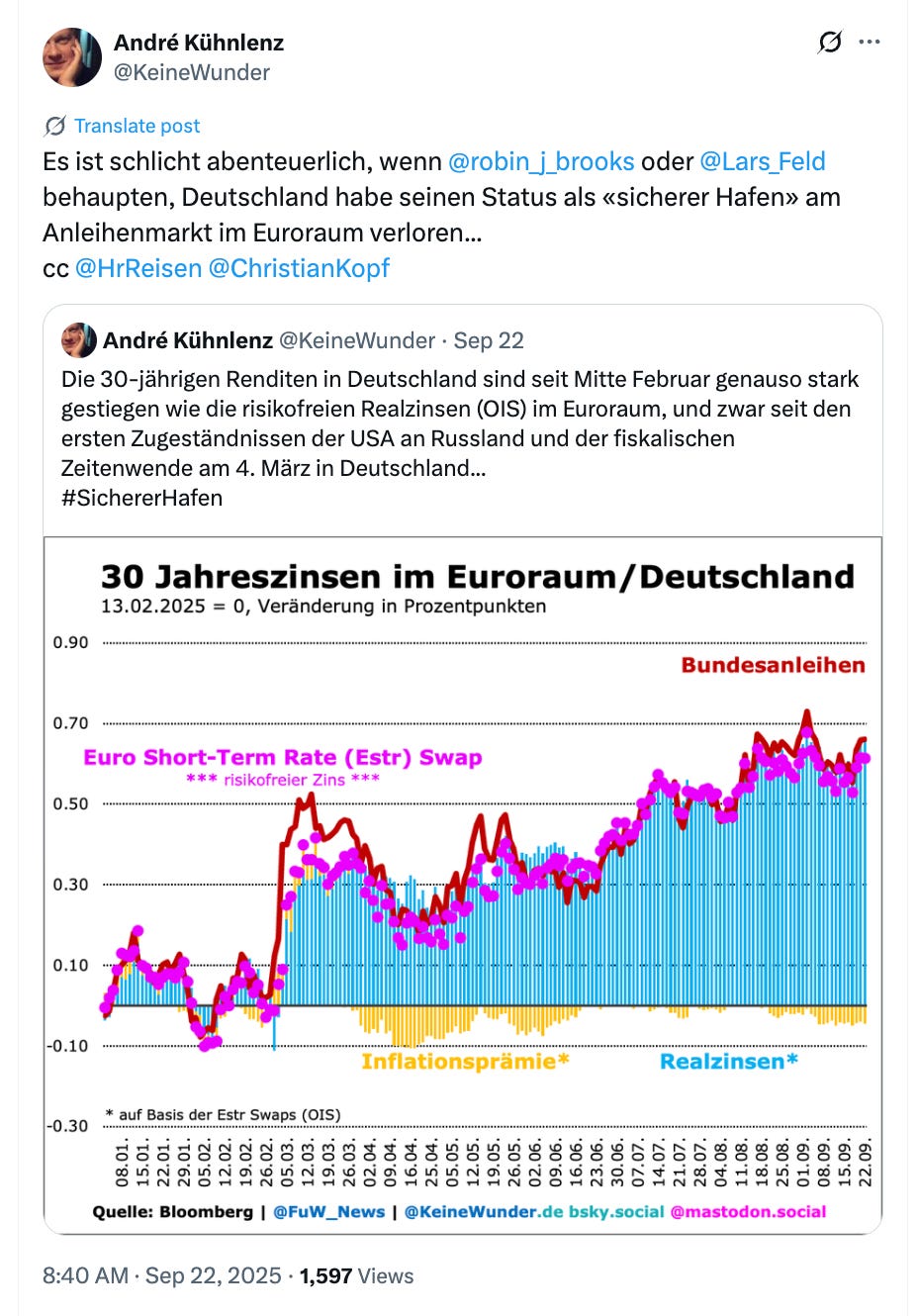 NO just because German yields have risen does NOT mean that German debt has lost its standing a safe haven asset. 30 year German debt yields have risen exactly in line with risk-free real rates across the Eurozone.