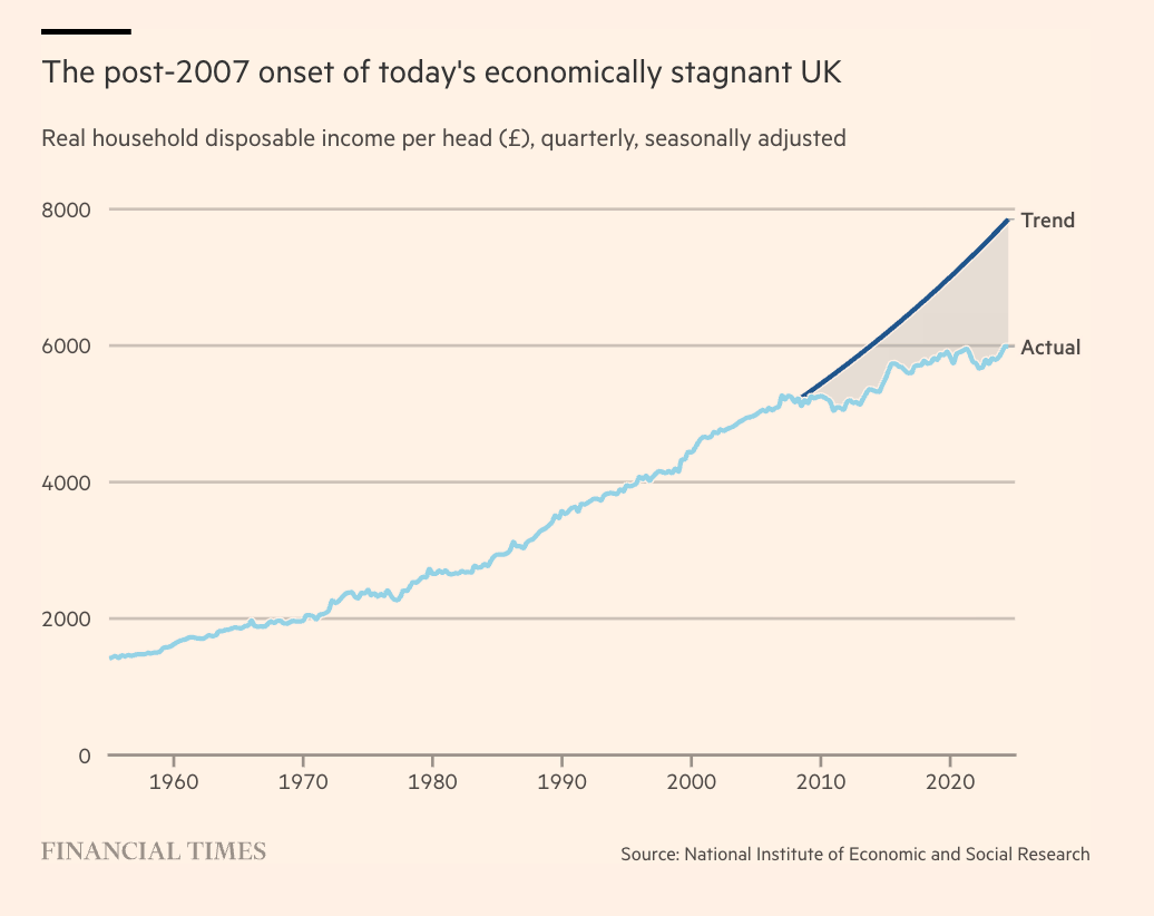 Numbers tell the story. According to the Living Standards Review 2025 from the National Institute of Economic and Social Research, real disposable income per head rose by just 14 per cent between the third quarters of 2007 and 2024: it had risen 48 per cent between the third quarters of 1990 and 2007.