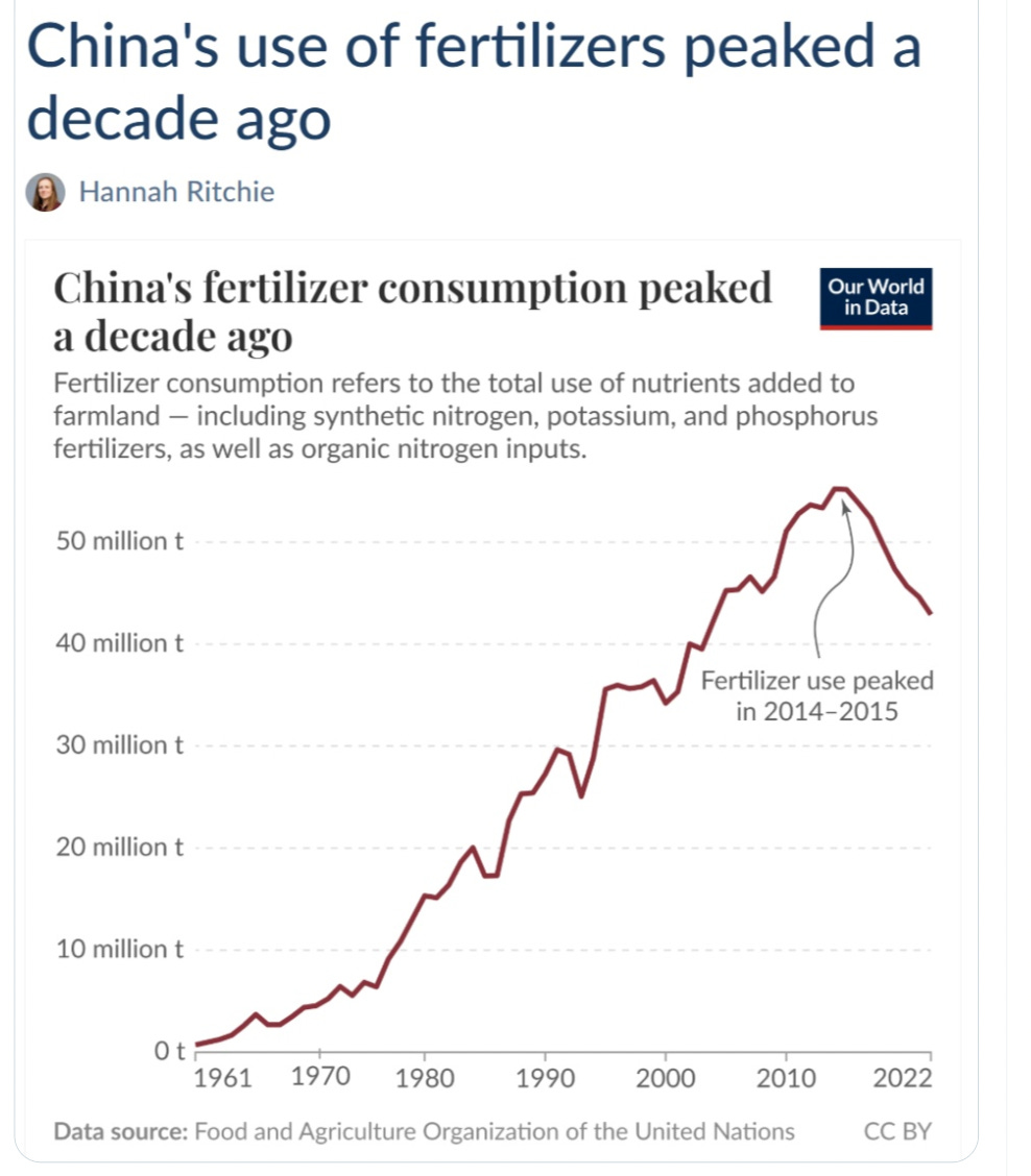And here is some more good news. China’s fertilizer use peaked ten years ago