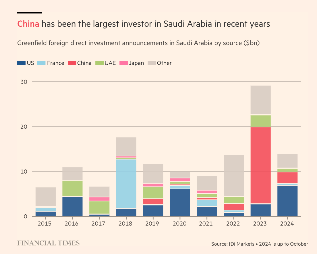 Chinese exports and investment are pouring into Saudi Arabia as the kingdom’s demand for green tech deepens a relationship once defined by oil sales and challenges business ties with its traditional western partners. Bilateral trade has for many years been almost totally dominated by Chinese purchases of Saudi oil. But now, Chinese exports to Saudi Arabia are tracking towards a record high, at $40.2bn in the first 10 months of the year, up from $34.9bn for the same period last year, according to Chinese government data. China has also become the kingdom’s largest source of greenfield foreign direct investment, with investments from 2021 to October this year totalling $21.6bn, about a third of which were in clean technologies such as batteries, solar and wind, according to investments tracked by fDi Markets. This compares with $12.5bn from the US, the next highest. The figures herald a sea change, with China eclipsing the kingdom’s traditional investment partners, the US and France. Many of the Chinese deals have yet to show up in official Saudi figures, indicating the capital has yet to be deployed