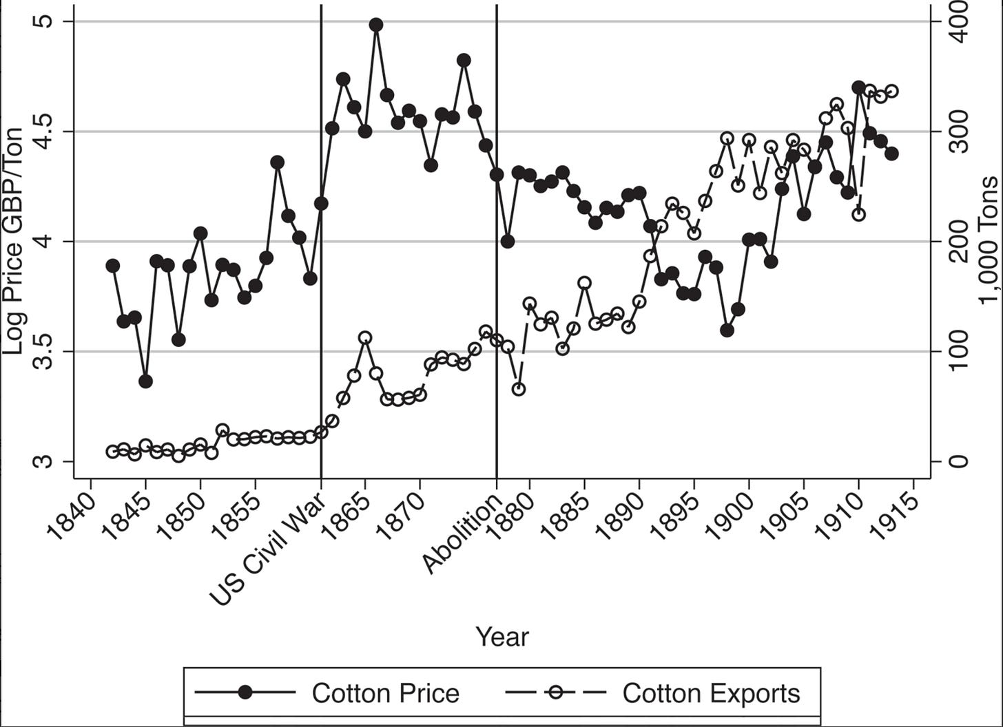 To investigate the effects of trade booms on labor coercion under Egypt’s dual-coercive system, I focus on two key events. The first event is the cotton boom during the U.S. Civil War in 1861–1865. Egypt, a global producer of high-quality long-staple cotton, quadrupled its cotton production and exports by 1865 (Figure 1). Unlike the United States, Egypt did not have international market power on the eve of the cotton boom, and hence, cotton prices were largely exogenous. …