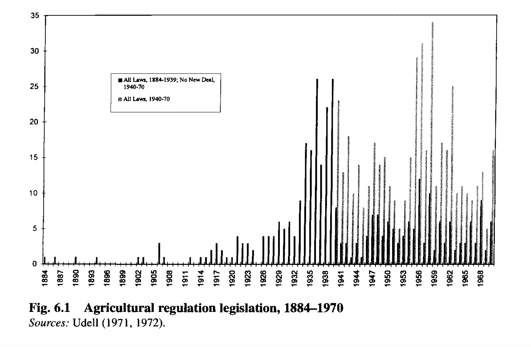 How the New Deal created the regulatory system of US agriculture. See the way that a gap opens up between “all legislation” in agriculture (light grey) and non-New Deal legislation (dark bar).